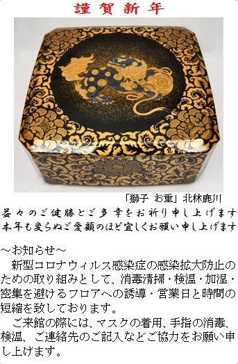 2020年12月20日 / 最終更新日時 : 2020年12月20日 大澤 一成 未分類 初市 初市一月六日(水)~十七日(日) 本年も割引価格を多数品揃え!忘れなかったあのお品今がご入手のチャンスです。あなたからのお声掛けを心よりお待ち致しております。美術品との出会いをお手伝いさせてください。